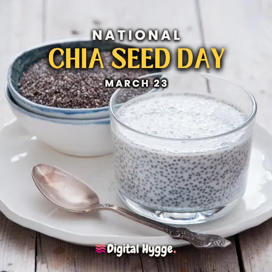 National Chia Day, observed annually on March 23, celebrates the nutritional power and ancient history of the chia seed. The day was established in 2016 by Mamma Chia, the first organic chia-based food and beverage company.